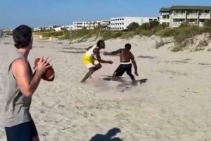 休赛期生活!马瑟林和内史密斯在沙滩玩橄榄球