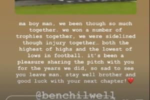 詹姆斯写到:兄弟,我们一起经历了太多。我们一起赢得了许多奖杯,也一起因伤缺阵……一起经历了足球生涯中的巅峰和低谷。这些年来,能和你一起并肩作战是我的荣幸,很遗憾看到你离开。兄弟保重,祝你接下来的篇章好运!
