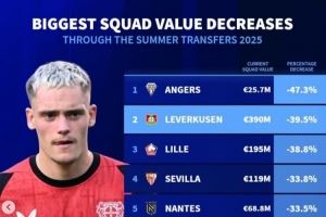 德转列今夏身价下跌比例榜:法甲7队,药厂、塞维、莱比锡在列