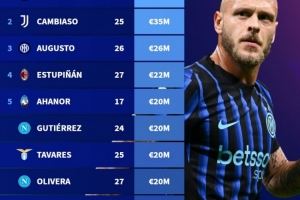 3、奥古斯托(国际米兰),26岁,2600万欧元